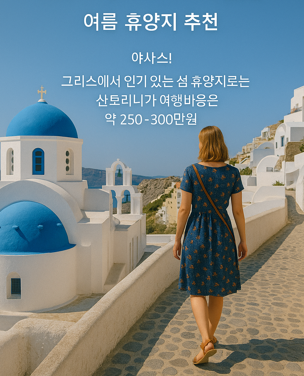 “야수(Yassou)!” 그리스식 인사로 시작하는 산토리니 여행여름이 되면 더 선명하게 빛나는 나라, 그리스.그중에서도 **산토리니(Santorini)**는 바다와 하늘, 하얀 건물이 완벽하게 조화를 이루는 그림 같은 섬입니다.그리스에서는 “야수(Yassou)”라고 인사하며 일상을 시작해요. 처음 보는 관광객에게도 활짝 웃으며 인사해주는 따뜻한 사람들 덕분에 낯선 곳도 금세 익숙해집니다.🏖️ 산토리니 여행 코스 추천 (4박 5일)1일차:섬 도착 후 호텔 체크인근처 마을 산책, 에게해 석양 감상2일차:오전: 푸른 지붕의 하얀 마을 산책오후: 케이블카 탑승 및 항구 전망 감상저녁: 야외 테라스에서 저녁 식사3일차:오전: 화산 지대 트레킹 or 요트 투어오후: 현지 마켓과 작은 교회 구경저녁: 일몰 명소에서..